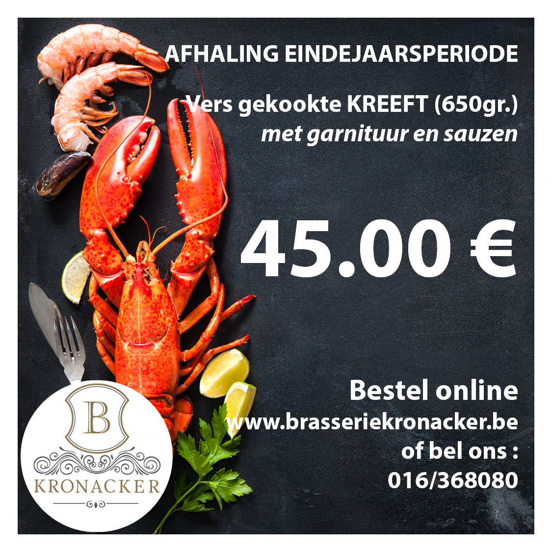 Op zoek naar een feestelijke blikvanger voor jouw eindejaarsmenu? Bij Brasserie Kronacker koken we onze kreeften dagvers en met de grootste zorg, zodat jij thuis kunt genieten van topkwaliteit zonder stress in de keuken. Bestellen kan via de website. Afhalen bij Brasserie Kronacker